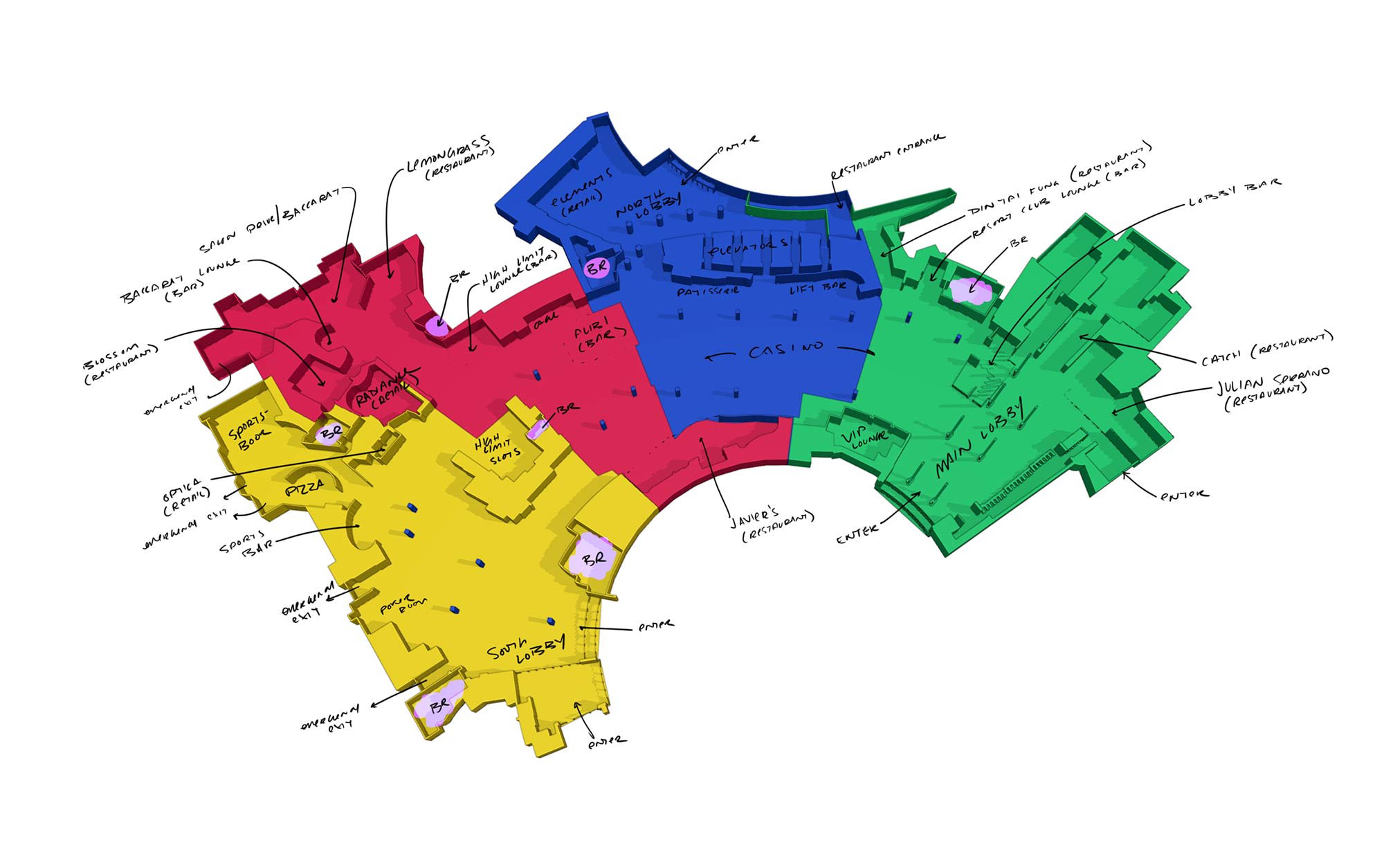 After building the virtual replica of the physical space, we populated it with hundreds of 3D bots. We programmed these “bot guests” with a simple human behavior AI system – they wander the casino, sit at tables, and walk towards restrooms and exits just as guests would in real life.